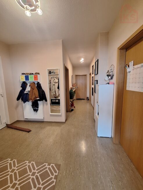 Es empfängt Sie die Diele mit anschließendem Flur, von welchem Sie zwei Schlafzimmer, das Bad und den großen Hauswirtschafsraum dieser Wohnung erreichen.